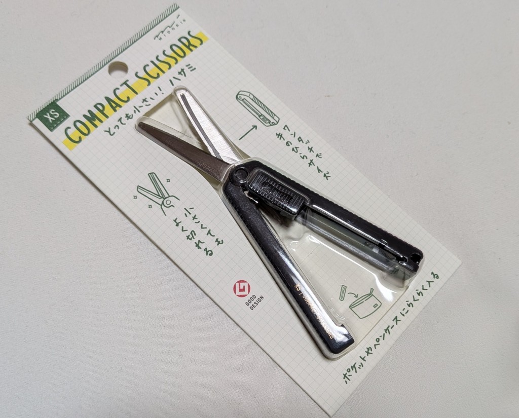 ハサミ派かカッター派かと問われれば、私はだんぜんハサミ派。機能的にもデザイン的にも結局、多少手間がかかったとしてもキレイな仕上がりが望めるし、本体自体の形もカワイイ、絵になる。カッターは所詮まっすぐ切るにも金属定規やガイドする切れてもよいラインやガードが必要になる。短い糸などを切る時もハサミの方が安全で重宝する。ただミニサイズのハサミとなると、一流ブランドや調理・園芸に関する特殊な誂え物や化粧・医療小物などの専門外では、これまでおもちゃみたいで、手芸や工作ものでも、セットになっているような安価なものはプレスの具合も素材も悪く、切れ味もあまり良くないものが多かった。ところが、このMIDORIのXSコンパクトハサミ(税込836円)は機能性と携帯性を追求されたステーショナリーシリーズの一つで、柄の中に刃の部分がワンタッチスライドで収まる、カバーさえ不要の優れもの!程よいバネの感じが小気味よい切れ味に一役買っていて、プラスチックの表面に溝を刻んだ持ち手の細かい加工で小さいのに安定感があり手に非常におさまりが好い、見事に考えられたデザインだ。もちろんミニカッターや修正テープ、テープのりなど様々あるのでサイトや扱いのある店頭でその違いをひとしきり眺めて吟味するのも愉しい。セットで実用ギフトにするのも洒落ている。